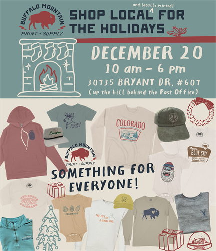 We're opening up the print shop for in-person printing again this Saturday, 12/20! Come do your holiday shopping and find Evergreen, Colorado, and mountain-inspired apparel for everyone one your list. Everything is printed, embroidered, and crafted right here in Evergreen, with love, by us. We're just up the big hill behind the Post Office, centrally located and just up from Downtown & the Lake. We'll also have a few artist friends selling souvenir glassware and other home goods so take a break from the hustle and bustle and see where your apparel is printed.