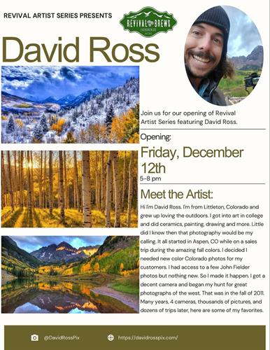 Join us this Friday for our Art Opening featuring local artist David Ross. David is from Littleton, Colorado. His love for the outdoors lead his art career to photography. Come enjoy his amazing photos of the beautiful west. Need a Christmas gift??? All his gorgeous photography is beautifully framed and ready to hang!! Free red wine tasting as well!! Food specials, craft Christmas cocktails, mocktails and more. We hope to see you there!! Cheers!! @DavidRossPix https://davidrosspix.com/