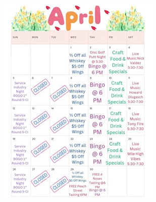 Wednesdays- Happy Hour 3 to 5pm!! Half off all our craft Colorado Whiskeys & $5 off our delicious wings with your choice of house made sauce open to close. Whiskey and wing lovers these specials are for you!! Come enjoy top quality food and drinks at a discount!! Take a mid-week break and enjoy a night off!! Cheers!