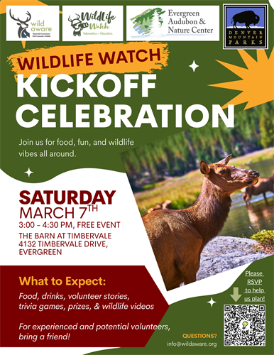 Join the Wild Aware crew as we team up with Evergreen Audubon Nature Center and Denver Mountain Parks for the Wildlife Watch Kickoff Celebration.