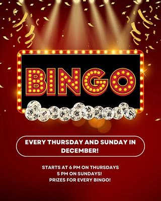 SERVICE INDUSTRY NIGHT EVERY SUNDAY 5PM TO CLOSE!! PLUS, FREE BINGO SUNDAYS IN DECEMBER!!